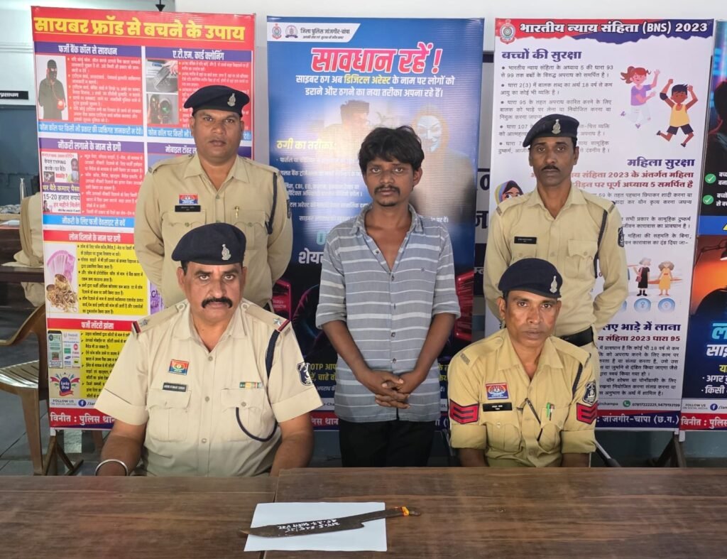 थाना चांपा पुलिस टीम को पेट्रोलिंग के दौरान मुखबिर से सूचना मिली कि नया बस स्टैंड में एक व्यक्ति तलवारनुमा चाकू लेकर आते-जाते लोगों को डराकर मारने दौड़ा रहा है। स्थिति की गंभीरता को देखते हुए सूचना को तत्काल जिले के पुलिस अधीक्षक श्री विजय कुमार पाण्डेय (भा.पु.से.), अतिरिक्त पुलिस अधीक्षक श्री उमेश कश्यप एवं SDOP चांपा श्री यदुमनी सिदार को अवगत कराया गया। अधिकारियों ने तुरंत आरोपी को पकड़कर वैधानिक कार्रवाई करने के निर्देश दिए।