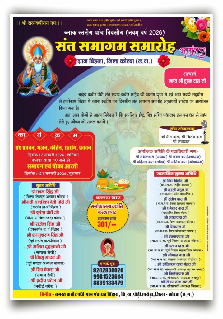 संत कबीर साहेब की अमृतवाणी, भक्ति, ज्ञान और समरसता के संदेश को जन-जन तक पहुँचाने के उद्देश्य से ग्राम बिंद्रा, जिला कोरबा (छत्तीसगढ़) में ब्लॉक स्तरीय पाँच दिवसीय संत समागम समारोह (नवम वर्ष 2026) का भव्य आयोजन किया जा रहा है। यह आध्यात्मिक आयोजन 17 जनवरी 2026 से 21 जनवरी 2026 तक श्रद्धा, भक्ति और सामाजिक समरसता के वातावरण में संपन्न होगा।