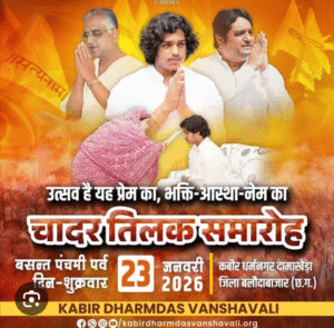 रायपुर। सद्गुरु कबीर साहेब द्वारा स्थापित बंश बियालिस प्रणाली के अंतर्गत कबीरपंथ के इतिहास में एक और स्वर्णिम अध्याय जुड़ने जा रहा है। कबीरपंथ के 16वें वंशाचार्य पंथश्री उदितमुनी नाम साहेब का विधिवत चादर तिलक समारोह बसंत पंचमी के पावन अवसर पर 23 जनवरी को कबीर धर्मनगर दामाखेड़ा में श्रद्धा, भक्ति और भव्यता के साथ सम्पन्न होगा। यह ऐतिहासिक समारोह 15वें वंशाचार्य पंथश्री हुजूर प्रकाश मुनि नाम साहेब के सानिध्य में आयोजित किया जाएगा।