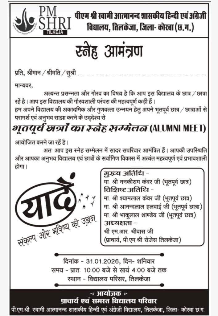 कार्यक्रम का आयोजन प्राचार्य पीएमश्री सेजेस तिलकेजा, समस्त विद्यालय परिवार एवं शाला प्रबंधन एवं विकास समिति (SMDC) के अध्यक्ष श्री किशन साव के नेतृत्व में किया जा रहा है। आयोजकों के अनुसार यह स्नेह मिलन ‘अपनी माटी–अपना गौरव’ की भावना को सशक्त करेगा और वर्तमान विद्यार्थियों को पूर्व छात्रों के संघर्ष, अनुभव और सफलता से प्रेरणा देगा।